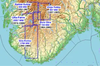 Ab Anfang der 1950er Jahre begann die norwegische Behörde für Gewässer und Elektrizität (Norges vassdrags- og elektrisitetsvesen, heute Norges vassdrags- og energidirektorat, NVE) mit dem Bau der ersten Speicherkraftwerknetze in den südlichen Provinzen (Fylker) Rogaland, Agder und Telemark. Bis 1988 entstanden hier fünf der heute größten Netze Norwegens mit insgesamt über 6 GW installierter Leistung.[1] Die Netzwerke aus einer Vielzahl aus Stauseen und Speicherkraftwerken liegen in den Hochebenen und Berggebieten der Ryfylkeheiane und Setesdalsheiene und sind benannt nach den jeweiligen größten Flussläufen. Nach ersten Planungen Ende der 1960er Jahre[2] wurde ab 1974 das Ulla-Førre-Speicherkraftwerknetz östlich von Haugesund errichtet, bestehend aus über 20 Stauseen und 6 Kraftwerken. Dafür war der Bau von 100 Kilometer neuer Straßen für den Schwerlastverkehr sowie von 100 Kilometer Druckstollen und Kavernen nötig. Der größte Stausee Blåsjø wurde als Zusammenschluss einer Vielzahl von kleineren und größeren natürlichen Seen an der Grenze zwischen Rogaland und Agder geplant. Für die Schaffung eines Magazinvolumens von drei Kubikkilometern, mit einer Oberfläche von 80 Quadratkilometern, war die Errichtung von 14 Absperrbauwerken nötig, darunter einige der größten Staudämme und Staumauern Norwegens.[3]