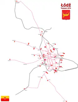 | 18 | RETKINIA – Wyszyńskiego, Bratysławska, Karolewska, Bandurskiego, Mickiewicza, Piłsudskiego, Kilińskiego, Rodziny Poznańskich, Węglowa, Tramwajowa, Narutowicza, Konstytucyjna, Pomorska - TELEFONICZNA ZAJEZDNIA | 11,6 km | 44 | 26 | Konstal 805Na, Pesa 122NaL | 30 min