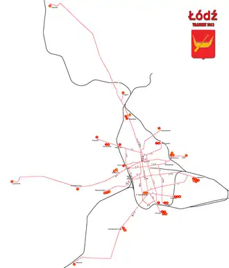 | 6 | CHOJNY KURCZAKI – Rzgowska, pl. Niepodległości, Piotrkowska, Mickiewicza, Kościuszki, Zachodnia, Ogrodowa, Północna, Nowomiejska, Franciszkańska, Wojska Polskiego, Strykowska - DOŁY | 12,6 km | 50-52 | 25 | Konstal 805Na, M8CN | 15 min | 15 min | 20 min |