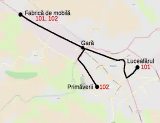 Die Linie 101 verlief in Ost-West-Richtung durch die Stadt, vom Industriegebiet zur Innenstadt. Die Linie 102 fuhr von der östlichen Endstelle zunächst auf der gleichen Strecke wie die 101 und zweigte dann am Bahnhof (Gară) etwa in der Mitte der Strecke in südlicher Richtung ab. Sie verband das Industriegebiet mit einem dicht besiedelten Stadtteil, ohne die Stadtmitte zu berühren.