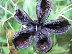 Es stehen meist fünf dicht braun-gelb wollig behaarte Balgfrüchte zusammen. Die Früchte reifen im August.