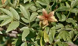 Die wechselständig angeordneten Laubblätter sind gestielt. Die Blattspreiten sind doppelt dreiteilig. Die Blattabschnitte sind bei einer Länge von 4,5 bis 8 Zentimeter und einer Breite von 2,5 bis 7 Zentimeter eiförmig. Blattoberseite und -unterseite sind kahl. Die Endabschnitt sind tief dreilappig und die diese Blattlappen sind wiederum zwei- oder dreilappig oder manche ungelappt. Alle Blattlappen besitzen ein spitzes oberes Ende.