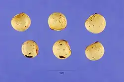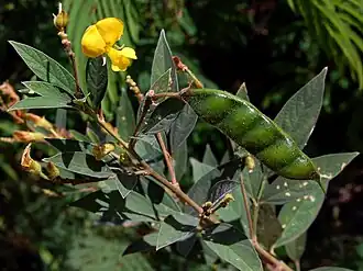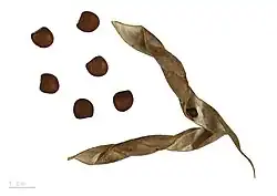 Die Hülsenfrüchte sind strohfarben, aber oftmals violett-schwarz überzogen, behaart und drüsig. Sie sind nahezu gerade, 4,5 bis 10 cm lang und 0,8 bis 1,4 (selten auch nur 0,5) cm im Durchmesser und bei den Samen leicht eingeschnürt. Die Samen sind gelbbraun, cremefarben, braun oder rötlich mit einem kastanienbraunen Hilum, sie sind schwach und fein gekörnt, 6 bis 6,5 mm lang und 4,5 bis 5,5 mm breit.