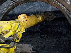 Im Bergbau wurden die ersten Streckenvortriebsmaschinen im 20. Jahrhundert eingesetzt. In den 1960er Jahren wurden im deutschen Steinkohlenbergbau die ersten Vollschnitt-Streckenvortriebsmaschinen zu Versuchszwecken eingesetzt.[8] Im Jahr 1970 erfolgte auf der Zeche Minister Stein der erste Einsatz einer Vollschnittmaschine zur Auffahrung einer Gesteinsstrecke.[20] Mit Vollschnittmaschinen können bauartbedingt nur kreisförmige Streckenquerschnitte erstellt werden.[13] In der Streckenauffahrung können tägliche Auffahrleistungen von bis zu 25 Metern erzielt werden.[8] Um die Maschinen unter Tage montieren zu können, müssen zunächst eine der Maschinenlänge angepasste Montagekammer und eine der Montagekammer vorgelagerte Startröhre von mehreren Metern konventionell erstellt werden. Nachdem die Maschine dann zusammengebaut ist, wird sie mittels Vorschub in die Startröhre gefahren und beginnt dort den eigentlichen vollmechanischen Streckenvortrieb.[21] Das herausgelöste Gestein wird anschließend über einen mit der Maschine über Zuggestänge verbundenen Nachläufer abgefördert.[22] Für die Förderung werden im Nachläufer Kratzkettenförderer und Förderbänder eingesetzt.[13]