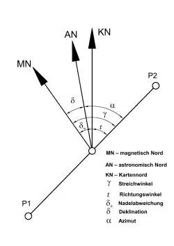 Der Streichwinkel γ ist in der Vermessung und im Markscheidewesen der Horizontalwinkel zwischen magnetisch Nord (MN) und einer Messungslinie.