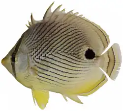 - Von den Falterfischen (Chaetodontidae) der tropischen Korallenriffe denen sie äußerlich sehr ähneln, lassen sich die Streifenfalterfische anhand ihrer Schwanzflosse und der Stellung der Bauchflossen unterscheiden. Während erstere bei den Falterfischen normalerweise gerade abschließt oder abgerundet ist, ist sie bei den Streifenfalterfische eingebuchtet oder gegabelt. Die Bauchflossen der Falterfische liegen direkt oder fast unterhalb der Brustflossen, bei den Streifenfalterfische deutlich dahinter.[2] Eine nähere Verwandtschaft mit den Falterfischen besteht nicht. Junge Streifenfalterfische haben die für Falterfische typischen Augenflecken. Die Larven sind allerdings wesentlich schlanker als die der Falterfische und sie besitzen nicht die für das Tholichthys-Stadium der Falterfische typischen Kopfstacheln.[1]