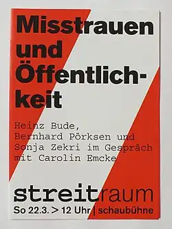 - ↑ Mitteilung zur Veranstaltung Misstrauen und Öffentlichkeit schaubuehne.de, abgerufen am 2. März 2015.