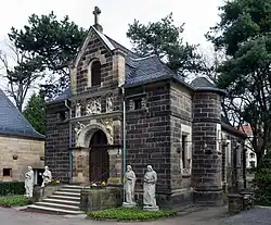 Die Friedhofskapelle stammt wie die Anlage selbst von Gotthilf Ludwig Möckel. Sie wurde bis 1883 im Stil der Neuromanik in Sandstein errichtet und hat über dem Portal ein Relief mit der Darstellung der Beweinung Christi. Es wird von den Darstellungen von Adam und Eva flankiert, am Rundbogen seitlich sind Gabriel und Michael zu sehen.[7] In der Kapelle, die einen hohen Turm mit der am 14. April 1892[5] geweihten Glocke hatte, fanden 14-täglich Gottesdienste statt. Möckel errichtete zudem eine Totenbettmeisterwohnung mit zugehörigen Anbauten.[8] Die Friedhofsanlage wurde aufgrund des raschen Bevölkerungswachstums Striesens erstmals um 1900 erweitert. In den 1930er-Jahren mussten zudem Verwaltungsgebäude und Leichenhalle ausgebaut werden.[9]