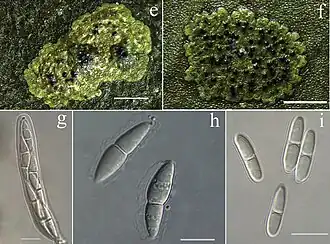Strigula smaragdula: e Thallus mit Perithezien (HMAS–L 06211). f Thallus mit Pyknidien (HMAS–L 0138067). g Ascus mit 8 zweireihigen Sporen (HMAS–L 0138066). h Ascosporen (HMAS–L 0138066). i Macrokonidien (HMAS–L 0138066). Balkenlänge: e, f = 300 μm; g, h, i = 10 μm. | ||||||||||||