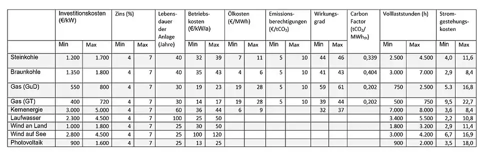Stromgestehungskosten konventioneller Anlagen sind somit von Marktpreisen der Brennstoffe und von Strompreisen abhängig, da der Spread zwischen Strompreis und Brennstoffpreisen in jeder Stunde bestimmt, ob das Kraftwerk fährt und welche Marge es dabei erzielt. Diese müssen über den gesamten Amortisationszeitraum mit ihrer stündlichen Struktur prognostiziert werden. Eine Studie des VGB PowerTech e. V. kam 2015 zu der nebenbei gezeigten Aufstellung.[14]
