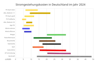 Stromgestehungskosten für verschiedene Stromerzeugungsanlagen in Deutschland. Datenquelle: Fraunhofer ISE; Juli 2024[11]