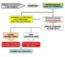 Das vom Körper aufgenommene Strontium setzt sich zusammen aus dem Strontium im Trinkwasser und dem Rest der Nahrungskette. Die Herkunft und die Zusammensetzung der Ernährung hat also einen großen Einfluss. Aufgrund der Biopurifikation haben verschiedene Organe von Pflanzen unterschiedliche 87Sr/86Sr-Verhältnisse.[7] Das Verhältnis von 87Sr/86Sr weist dann zwar über die Nahrungskette hinweg keine relevante Fraktionierung auf,[8] die unterliegende Geologie kann aber kleinräumig sehr große Variation aufweisen, besonders in alpinen Gebieten. Dort kann es auch vorkommen, dass zwei weit entfernte Gebiete dieselbe Isotopensignatur aufweisen. Dazu kommt, dass atmosphärisch eingetragener Staub sich auf den Strontiumabdruck von Böden auswirkt.[7] Böden können dazu über ihre Entwicklung hinweg unterschiedliche Sr-Signaturen aufweisen, weil die primären Sr-Lieferanten (Karbonate, Plagioklase) relativ schnell verwittern und dann weniger Strontium ins Grundwasser abgeben.[9] Biomasse entlang der Küste hat immer eine ähnliche Sr-Signatur, weil Ozeanwasser global ein 87Sr/86Sr-Verhältnis von 0.7092 aufweist und mit Regen aufs Land transportiert wird.[10] Die Analyse von 87Sr/86Sr ist allgemein problematisch in Populationen, welche viel Salz konsumierten: Dies wurde über weite Strecken verhandelt, und Meersalz in der Ernährung trägt logischerweise zu einer Annäherung an den ozeanischen Strontiumabdruck bei.[11]