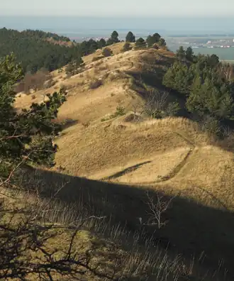 ![]() Blick vom Ziegenberg zum Struvenberg, an dessen Westende (außerhalb des Bildes) sich die Reste der Struvenburg befinden | ||