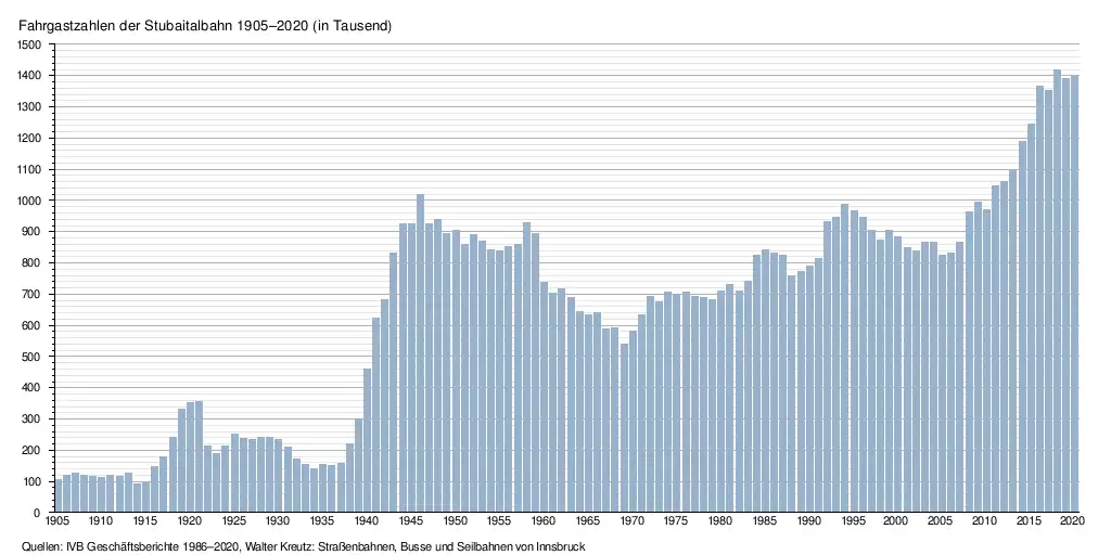 Diese Grafik zeigt die Entwicklung des Fahrgastaufkommens der Stubaitalbahn zwischen 1905 und 2020.[19][23] Die Fahrgastzahlen ab 2002 sind in der folgenden Tabelle zusammengefasst: