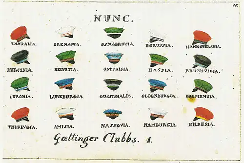 Die Corps, die früheste Form der heutigen Verbindungen, verbanden gegen Ende des 18. Jahrhunderts äußere Elemente der Studentenorden – straffes Reglement, verbindliche Zusammengehörigkeit, geheime Identitätssymbole – mit denen der alten Landsmannschaften – lateinische Landesnamen, farblich einheitliche Kleidung (Vorläufer der Couleurs).[30] Das Streben nach Verbindlichkeit und demokratischen Strukturen im Sinne des deutschen Idealismus legte den Grundstein für die Entwicklung der für den deutschen Sprachraum typischen Studentenverbindungen.[31]