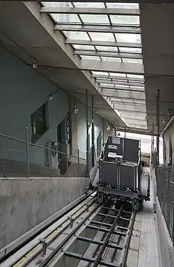 Seit 1924 verbindet ein für 750 kg ausgelegter Schrägaufzug die Talstation auf dem Platz vor dem Gebäude (514 m ü. M.) mit der Bergstation im 5. Stock (537 m ü. M.). Auf der 47 Meter langen Strecke gibt es sieben Zwischenstationen. Die Kabine für acht Personen wird von einer in der Talstation angeordneten Seilwinde angetrieben.[5]