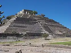 Das markanteste Gebäude der Ruinenstätte von Calixtlahuaca im Tal von Toluca ist ein steiler, 4-stöckiger Rundbau, auf den von Osten ein breiter Bauteil mit ca. 40 Stufen und flacher Rampe führt. Er wird von den Archäologen mit dem Windgott Ehecatl in Verbindung gebracht.