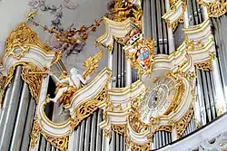III/P | 36 | Nach der Registerzahl die größte erhaltene Orgel von Johann Michael Stumm, erbaut als dreimanualige Orgel mit Hauptwerk, Unterpositiv, Echo und Pedaltürmen. 1778 spielte Wolfgang Amadeus Mozart auf der später nach ihm benannten Orgel.[25] 1936 von Steinmeyer umgebaut. Bei einer Renovierung 1966 durch Gebr. Oberlinger Orgelbau Entfernung der originalen Spielanlage und der gesamten Mechanik, Manual- und Pedalerweiterungen, Einfügung einer Zimbel im Echo, umfangreiche Erweiterung der Pedaldisposition. Der originale Spieltisch ist heute in der Fürstenloge ausgestellt.[26] |