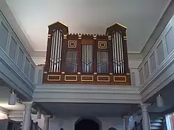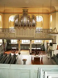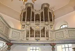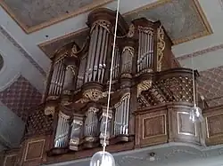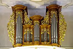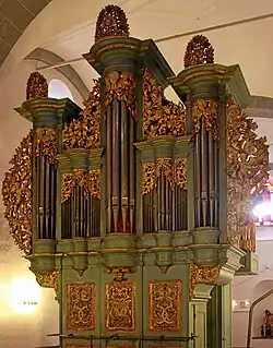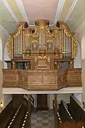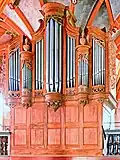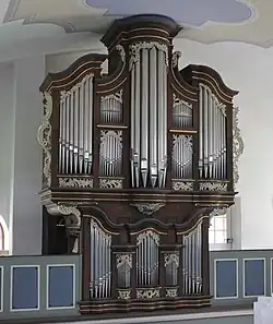 1737 Neubau durch Johann Michael Stumm, 1782 Umbauten durch Johann Nikolaus Stumm oder Johann Friedrich Stumm, von Gustav Stumm 1904 radikal umgebaut; von der ersten Orgel ist noch das Obergehäuse mit seinen für Johann Michael Stumm charakteristischen Rundtürmen und dem reichen Akanthus-Schnitzwerk erhalten.[15] Wesentliche Teile der Register Hohlpfeif, Principal, Flöt, Quint, Octav und Mixtur gehen ebenfalls auf Johann Michael Stumm zurück. | ||