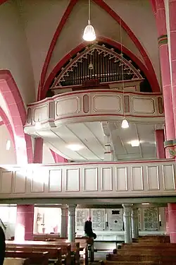 Nach verschiedenen Überarbeitungen im 19. Jahrhundert erfolgte 1895 Neubau durch Heinrich Voltmann; Reste des Stumm-Prospektes erhalten[36] | ||