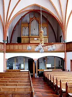 I/P | 10 | 1919 Erweiterungsumbau durch Walcker (II/P/15); 1962 Neubau durch Oberlinger; von Stumm nur Prospekt erhalten[24] |