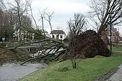 In den Niederlanden musste die Feuerwehr zu 10.000 Einsätzen ausrücken, und landesweit wurde der Bahnverkehr eingestellt. Der Flughafen Schiphol wurde zeitweilig geschlossen, weswegen über 300 Flüge gestrichen wurden. Zahlreiche Straßen wurden durch umgestürzte Bäume und Lastwagen blockiert.[17] Mehr als 60 Unfälle ereigneten sich durch umkippende Lkw. In Den Haag war der Wind so stark, dass Menschen auf der Straße beim Gehen den Halt verloren und stürzten.[19] Schwere Objekte wie Schiffscontainer wurden vom Wind umgeworfen.[20] Es kam zu zwei sturmbedingten Todesfällen: In Olst wurde ein Mann von einem Ast erschlagen, in Enschede fiel ein Mann in seinem Auto einem umstürzenden Baum zum Opfer.[21]
