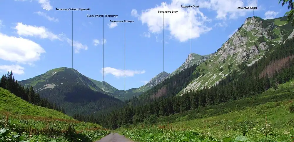 Die Staatsgrenze verläuft über den Hauptgrat der Tatra, auf dem sich die Suchy Wierch Tomanowy befindet. Nördlich des Gipfels liegt das Tal Dolina Kościeliska, konkret sein Hängetal Dolina Pyszniańska.