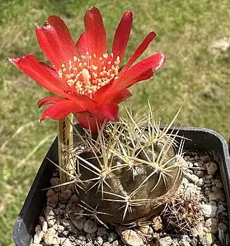 Die rötlichen, mit grünlichen oder bräunlichen Schuppen besetzten Knospen erscheinen aus seitlichen bis schulternahen Areolen. Die kurz trichterförmigen bis etwas verlängerten Blüten sind 35 Millimeter im Durchmesser und werden 25 bis 35 Millimeter lang. Das grünlich bis rötlichbraun gefärbte Perikarpell ist mit mehr oder weniger dreieckigen, hell- bis dunkelgrünen Schuppen besetzt. Die hell- bis dunkelrote Blütenröhre ist mit grünlichen, fingernagelförmigen und nach oben verlängerten Schuppen besetzt. Die äußeren spatelförmigen Blütenblätter sind hellrot bis leicht orange gefärbt. Die inneren, spatelig bis lanzettlich geformten Blütenblätter sind ähnlich gefärbt, jedoch nach unten hin manchmal gelb. Die gleichmäßig über die Innenseite des Receptaculum verteilten Staubfäden werden 6 bis 8 Millimeter lang. Die oberen sind gelb bis orange gefärbt und nur am Fuß violett, die unteren sind komplett violett gefärbt. Das weißliche, leicht violett oder grünlich gefärbte Nektarium ist sehr kurz und etwa 1 bis 1,5 Millimeter lang. Die frei stehenden, grünlichen Griffel werden etwa 1,5 Millimeter dick und 12 bis 15 Millimeter lang. Auf Höhe der obersten Staubfäden werden meist fünf weißliche Narbenstrahlen ausgebildet.