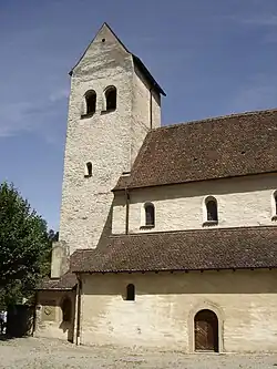 Die im Jahr 993 zu Ehren des frührömischen Märtyrers St. Cyriacus geweihte Basilika, heute evangelische Klosterkirche St. Cyriak mit romanischen Rundbögen ist ein bedeutendes Beispiel frühromanischer Architektur in Deutschland. Sie wurde zunächst als Kanoniker-Stift erbaut. und nach der Vergabe an das Bistum Basel wurde von Benediktinerinnen bewohnt. Der Kirchturm stammt aus dem 11. Jahrhundert; er gilt als der ältest erhaltene in Südwestdeutschland. Forschungen belegen, dass Teile der Balkenkonstruktion von einem Baum stammen, der im Winter 996 gefällt wurde. Die Vorhalle stammt aus dem Jahr 1309, die Holzdecke wurde 1510 gefertigt. Die letzte Renovierung der Kirche erfolgte 1964. Es finden sich bescheidene ornamentale Malerei und Reste alter Fresken. Von der ehemaligen Bemalung der Kirche ist nicht mehr viel erhalten, am interessantesten ist vielleicht die Säulen-Krypta mit vermutlich römischer Spolie.[26][27]
