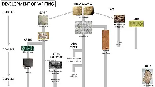 Die Stadt Uruk bekommt eine über Sumer weit hinausreichende Bedeutung. Aufgrund von Pflanzstädten wurde der nicht unumstrittene Begriff „Uruk World System“ für so etwas wie ein mutmaßliches Kolonialreich geprägt.[16] Im zentralen Eanna-Bezirk von Uruk entsteht eine sehr vielfältige, bis heute funktional nicht abschließend gedeutete Monumentalarchitektur, die in ihrer Komplexität und Größe an mittelalterliche Kathedralen erinnert. In der Schicht Archaisch IVa wurden die ältesten Tontafeln mit Schrift gefunden. Sie wurden unter anderem in den Resten eines großen Gebäudes gefunden, für das C14-Daten zwischen 3500 und 3310 v. Chr. vorliegen. Da das Gebäude eine Weile gestanden hat und die Erfindung der Schrift vor seiner Zerstörung stattgefunden haben muss, kann die älteste Schrift auf etwa 3350 v. Chr. datiert werden. In der unmittelbar folgenden Schicht Uruk III wurde der gesamte zentrale Eanna-Komplex radikal umgestaltet, ohne dass wir wüssten, welche historischen Veränderungen sich dahinter verbergen.[17]
