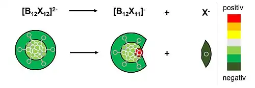 Superelektrophile Anionen sind eine Klasse von molekularen Ionen, die trotz ihrer negativen Gesamtladung hochgradig elektrophiles Reaktionsverhalten zeigen. Damit sind sie sogar in der Lage, die besonders unreaktiven Edelgase oder molekularen Stickstoff bei Raumtemperatur zu binden.[1][2] Die einzigen bisher bekannten Vertreter sind die aus den closo-Dodecaborat-Dianionen [B12X12]2− abgeleiteten Fragment-Ionen vom Typ [B12X11]−, wobei X für einen mit einem Boratom verbundenen Substituenten steht (vgl. Abb. 1). Aus diesem Grund behandelt der folgende Artikel ausschließlich superelektrophile Anionen dieses Typs.