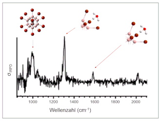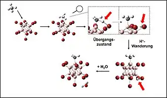 Zur Aufklärung des Reaktionsmechanismus' wurden Detailuntersuchungen zur Reaktivität von [B12Br11]− und [B12Cl11]− mit Methan in der Gasphase durchgeführt. Die Untersuchungen der Molekülstrukturen erfolgten dabei mithilfe der IR-Spektroskopie. Es konnte gezeigt werden, dass das elektrophile Boratom mit der wenig polaren C–H-Bindung reagiert. Der Kohlenstoff stellt den partiell negativen (nukleophilen) Teil der Bindung dar. Es kommt zu einer heterolytischen Bindungsspaltung der C–H-Bindung, was formal zu einem Carbanion [CH3]− und einem Proton H+ führt. Das Carbanion bindet an das elektrophile Boratom des [B12X11]−, sodass sich das Dianion [B12X11CH3]2− bildet, während das H+-Ion in der Gasphase elektrostatisch an dieses Dianion gebunden bleibt. Das insgesamt einfach geladene Ion [B12X11CH3]2−[H]+ ist eine Brønsted-Säure. Bei Kontakt mit Wasser bildet sich [B12X11CH3]2−[H3O]+, welches durch die charakteristische „Regenschirmschwingung“ des koordinierten Hydronium-Ions (H3O)+ nachgewiesen werden kann (vgl. Abb. 8 und 9).[3] Darüber hinaus wurden die Fragment-Ionen [B12Br11]− und [B12Cl11]− mit der Ion Soft-Landing-Methode auf Oberflächen deponiert und dort mit den Alkylketten von organischen Verbindungen zur Reaktion gebracht. Die Anbindung an die unpolaren Alkylketten geschah selektiv in Gegenwart von deutlich reaktiveren funktionellen Gruppen wie Aromaten und Estergruppen. Diese erstaunliche Bevorzugung von C–H-Gruppen als Reaktionspartner könnte damit zusammenhängen, dass in solchen Oberflächenschichten hydrophobe Alkylgruppen in Richtung Vakuum ausgerichtet sind. Die superelektrophilen Anionen reagieren direkt an der Grenzfläche zum Vakuum mit C–H-Gruppen der Phthalat-Alkylgruppen nach dem in Abbildung 8 dargestellten Mechanismus für Methan.[3]
