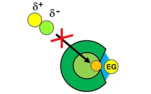 Nachdem das Edelgas an das Boratom gebunden hat, wird sein Austausch durch ein Nukleophil im Rahmen einer typischen SN2-Reaktion durch die Käfigstruktur des Borats verhindert, da die Edelgas-Bor-Bindung sterisch abgeschirmt ist (vgl. Abb. 6).
