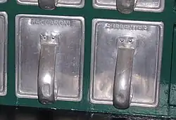 - ↑ Die Schütten in der seinerzeit modernen „Frankfurter Küche“ waren als Vorratsbehälter für kleinteilige Schüttware gedacht: Maccaroni und Suppenteig (zusammen mit anderen Suppeneinlagen oder -zutaten wie Gerste, Erbsen, Grünkern, Reis, Linsen, Bohnen, Graupen etc.) sollten auf diese Weise im Küchenalltag schnell griffbereit sein.