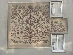 - Ornamentaler Lebensbaum, Sgraffito, 14 m², Rechberggasse 16–20, Wien 10 (1956)