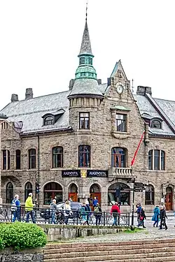Das Bauwerk befindet sich an einem zentralen Platz der Stadt und sollte den zwei Funktionen Arbeiten und Wohnen gerecht werden. Das Gebäude ist aus fein- und grobbehauenem Granit gefertigt und besitzt einen Turm, einen Giebel und einen Erker. Die Ikonographie des Gebäudes sind von der romanischen Architektur und auch von den Stabkirchen inspiriert. So wurden Ornamente im Urnes-Stil und das Eulen-Motiv verwendet.