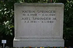 Am 3. Januar 1980, dem Tag der Beerdigung Rudi Dutschkes[8], beging Axel Springer jr. im Alter von 38 Jahren in Hamburg Suizid.[9] Er wurde auf dem Friedhof Groß Flottbek in Hamburg begraben.