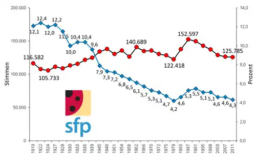 In der ersten Parlamentswahl 1907 konnte die Partei einen Stimmenanteil von 12,6 % erzielen und lag bis 1929 stabil bei 12 Prozent. In den 1930er Jahren erreichte die Sfp rund 10 Prozent. Nach dem Zweiten Weltkrieg sanken die Werte von 7,9 % kontinuierlich ab auf nur noch 4,2 % 1979. Danach konnte der Abwärtstrend gestoppt werden. In den finnlandschwedischen Siedlungsgebieten erzielt die Schwedische Volkspartei sehr hohe Wahlergebnisse. So erhielt sie bei den Kommunalwahlen 2004 in den Inselgemeinden Houtskär, Iniö und Korpo 100 % der Stimmen.[4]