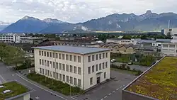 Gebäude des Hauptsitzes, im Hintergrund Produktionsgebäude