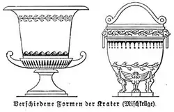 Das rituelle Trinkgeschirr bestand aus Trinkgefäßen Kylix, dem Mischgefäß Kratér und dem Kühler Psykter. Das Gefäß, aus dem der Wein (Oinos) entnommen wurde, war die Oinochoe, sein Pendant für Wasser die Hydria.