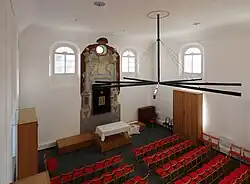 Trotz der langen Zweckentfremdung des Gebäudes sind noch Reste der Wandmalerei aus der Entstehungszeit und der Toraschrein vorhanden.