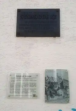 Im Zuge der Novemberpogrome 1938 wurde die Synagoge am Nachmittag des 10. November durch Brandstiftung zerstört und die Reste 1939 abgetragen.[9] Seit dem 4. September 1985 erinnert an der Südseite der Oststraße, angebracht an der rückwärtigen Mauer des Grundstücks Koblenzer Straße 23, eine Gedenktafel an die ehemalige Synagoge.[10][11] Es sind nur wenige Ansichten und Zeichnungen des Gebäudes erhalten[12]; ihr ehemaliger Standort (frühere Adresse: Oststraße 7[13]) liegt im rückwärtigen Bereich des heutigen Grundstücks Koblenzer Straße 19–21.[14]