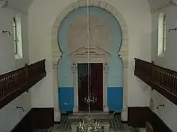 Der rechteckige zentrale Betsaal besitzt an drei Seiten Emporen mit hölzernen Balustraden für die Frauen. Der Toraschrein wird von zwei Säulen mit Kapitellen und einem gesprengten Dreiecksgiebel eingerahmt. Im Dreiecksgiebel befinden sich die Gesetzestafeln. Der Toraschrein und Teile des Mobiliars stammen aus der Synagoge in Peyrehorade, die 1747 eingeweiht wurde und nach dem Verkauf durch das Consistoire im Jahr 1898 wegen der Verbreiterung einer Straße abgerissen wurde.[1]