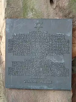 Beim Novemberpogrom 1938 wurde die Synagoge niedergebrannt. Die Feuerwehr schützte nur die Nachbarhäuser und eine in der Nähe befindliche Lackfabrik.