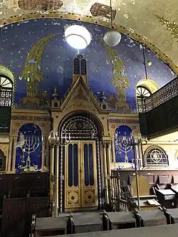 Das Bauwerk wird von Pilastern und hohen Rundbogenfenstern gegliedert. Der Innenraum ist in den Eingangsbereich und den Betsaal unterteilt. Der Eingangsbereich auf der Westseite besteht aus drei Räumen. Rechts liegt ein dem Tora-Studium vorbehaltener Raum, auf der linken Seite führt eine Treppe zur Frauenempore. Der Betsaal ist 18 mal 11 Meter groß und wird auf drei Seiten von der Frauenempore umgeben. In der Mitte des Raumes befindet sich die Bima, die von einem gedrechselten Holzgeländer eingefasst wird. Über dem Toraschrein an der östlichen Wand sind die Gesetzestafeln mit den Zehn Geboten angebracht. Die Wandmalereien stellen die Menora, Löwen, den Davidstern, die Zehn Gebote, die Stadt Jerusalem und Pflanzenmotive dar.