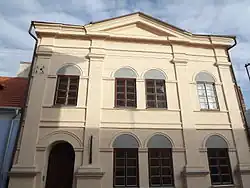 Die klassizistische Synagoge wird an der Straßenseite durch vier Pilaster gegliedert. Eine Rundbogenöffnung führt zum Portal des Gebäudes. Das zweistöckige Bauwerk schließt mit einem Gesims und einem dekorativen Dreiecksgiebel ab.