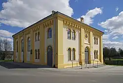 Das langgestreckte Gebäude ist mit einem Walmdach bedeckt. Die Wände sind durch Pilaster unterteilt, zwischen denen sich die Fenster und Türen befinden. Die Eingangsseite im Westen hat rechts und links der Tür auf zwei Stockwerken paarweise Rundbogenfenster. Über der Tür befindet sich auf der ersten Etage ein Okulus.