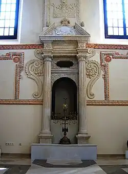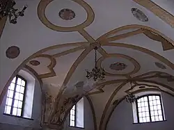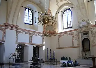 Das Hauptgebäude besitzt oben eine hohe Attika. Im Inneren wird der große Saal von einer hohen Gewölbedecke und zahlreichen Stuckaturen geprägt. Die Stuckaturen werden dem sogenannten Lubliner Typ zu geordnet. Der in der Synagoge vorhandene steinerne Toraschrein stammt aus der ersten Hälfte des 17. Jahrhunderts und damit aus der Bauzeit des Gebäudes.[2]