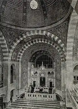 Das Gebäude ist im Stil der Neuromanik gestaltet. Der U-förmige Gebäudekomplex mit Tuffsteinverkleidung weist im Zentrum einen kuppelüberwölbten Zentralraum auf kreuzförmigem Grundriss mit Vorhalle auf, der von viergeschossigen Begleitbauten flankiert wird. Die Hauptfront wird ausgezeichnet durch eine dreibogige Portalanlage (ehemaliger Haupteingang) sowie eine große Giebelfassade mit mittig angeordneter Fensterrosette; der ehemalige zentrale Synagogensaal ist am Außenbau durch einen Kubus mit Rundbogenfenstern, Pyramidendach und schlanken Ecktürmchen in Anlehnung an byzantinische Vorbilder erkennbar.[1]