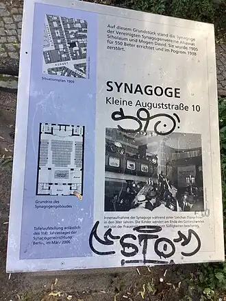 Die Synagoge in der Kleinen Auguststraße 10 in Berlin-Mitte wurde von den Vereinigten Synagogenvereinen Ahawas Scholaum und Mogen David als Gotteshaus gemeinsam genutzt. Im Novemberpogrom 1938 wurde sie zerstört. Seit 2006 erinnert ein Gedenkort auf dem Grundstück an die ehemalige Synagoge.